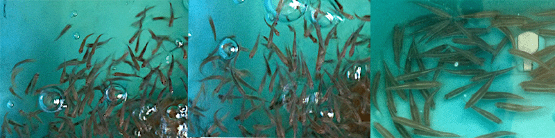 ○孵化後6ヶ月以内の幼魚(全長30mm〜)・・・・アユ・コイ用配合飼料に餌付けされた幼魚です。