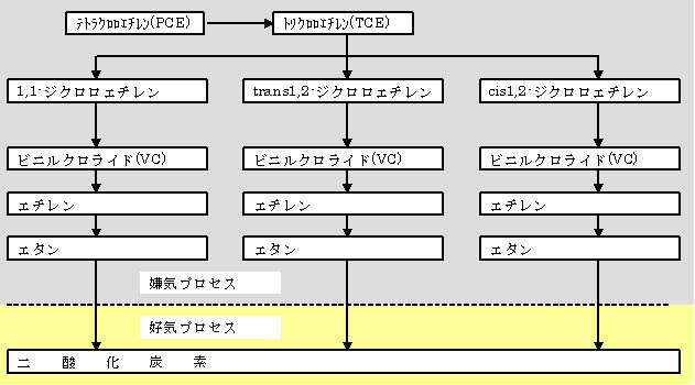嫌気条件下ではPCEがTCEへと分解されるプロセスが特徴である。分解産物としてDCE(ジクロロエチレン)、塩化ビニル(VC)