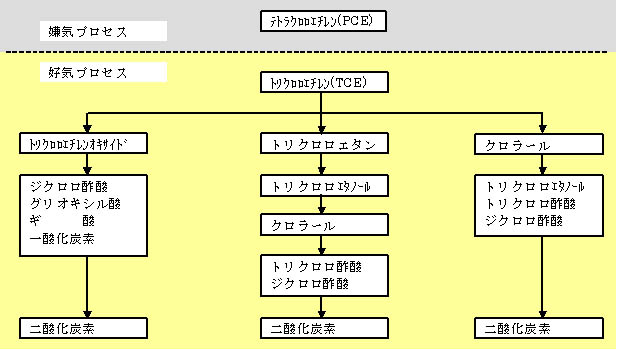 好気条件ではPCEは分解不可能とされている。しかしながらTCE以降の分解は速く、短期間に二酸化炭素と水にまで分解され、