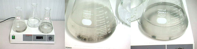 三角フラスコを少し冷まし(90℃)、これにEtBr(エチジウムブロマイド)が0.1μg/mιとなるように加えて撹拌する。