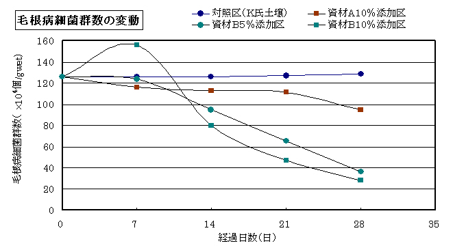 育苗用土に10%を加えた試験ではすべてが順調に生育し、8割が罹病しなかった。残り2割は軽い毛根病の症状を示したが、収穫物には何ら問題は無かった。